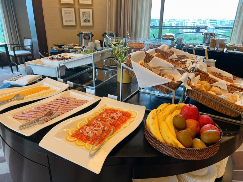 ホテル6~9階のクラブフロア宿泊者と、ハイアット上級会員「グローバリスト」は、専用のラウンジ「リージェンシークラブラウンジ」を利用できます。各時間に食事やドリンクが提供され、いずれも無料で頂けます。