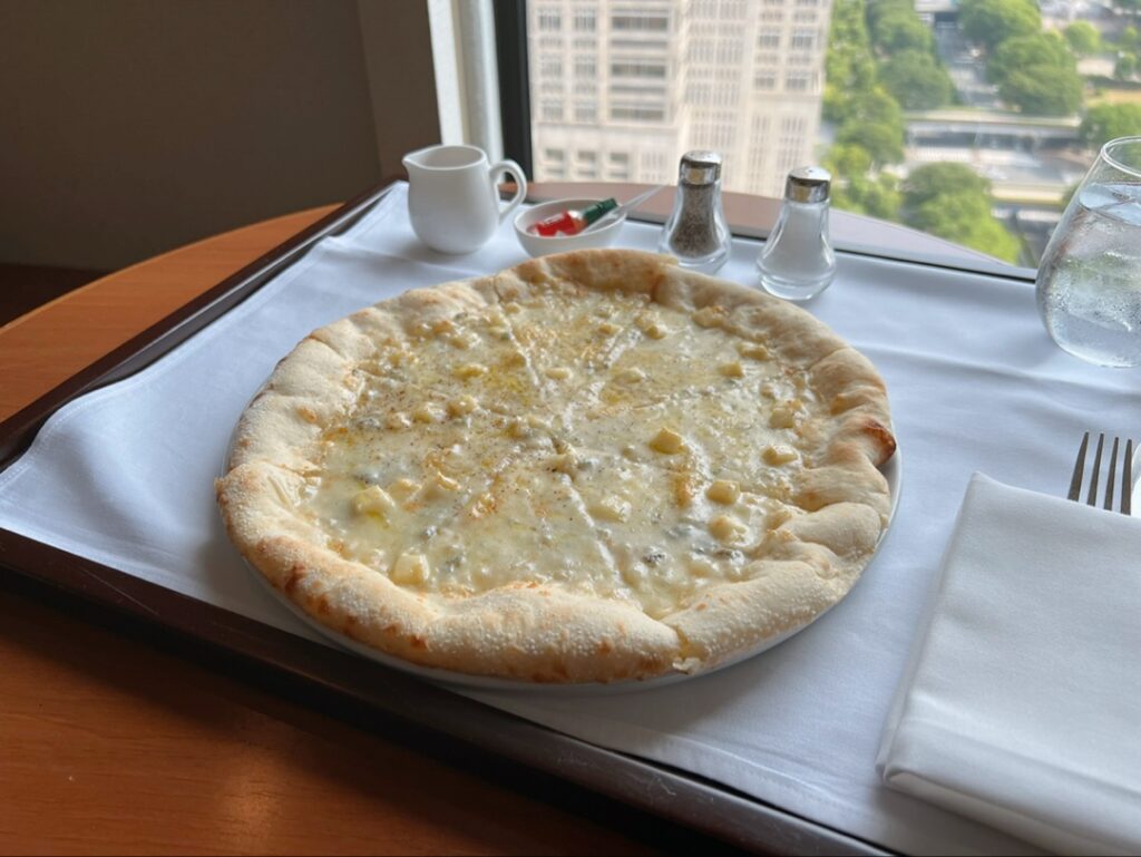 こちらは4種のチーズピッツァ(¥3,267)で、チーズの香ばしい香りがたまりません。