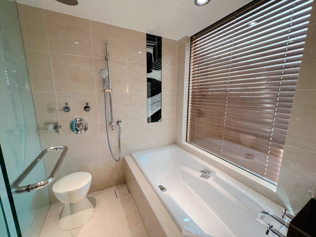 使い勝手は賛否両論ありそうな構造ですが、スイートのバスルームと錯覚させるような広さと開放感を感じさせます。