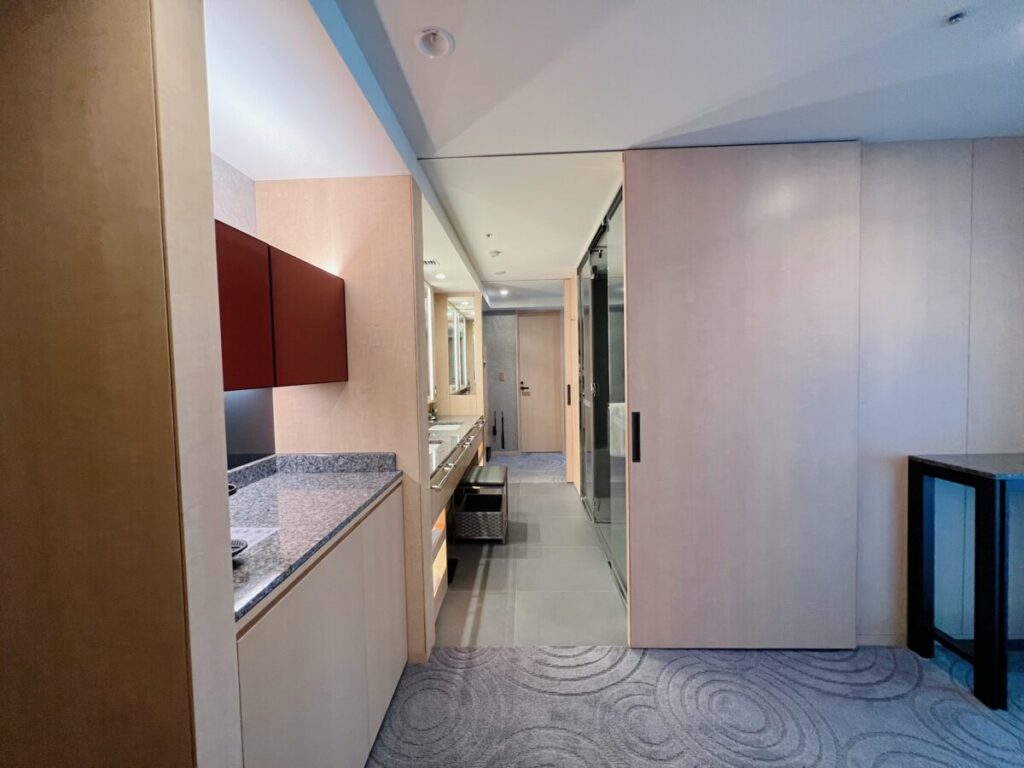 エントランス付近ミニバー、扉を開けるとグラスが美しくライトアップされています。ネスプレッソのコーヒーメーカーもあり、有料ですが、冷蔵庫の中も充実しています。